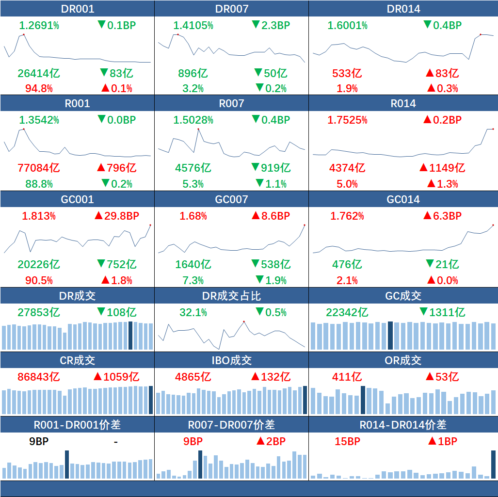 货币市场资金面均衡。今日成交86843亿元。DR001加权1.27%,较前日基本持平,DR007加权1.41%,较前日下行2BP。