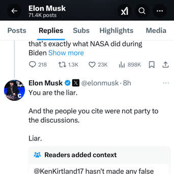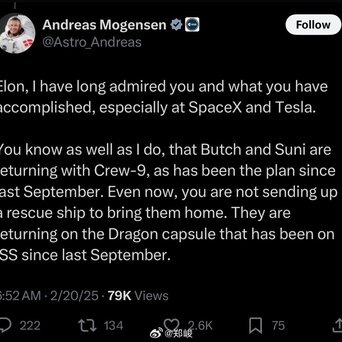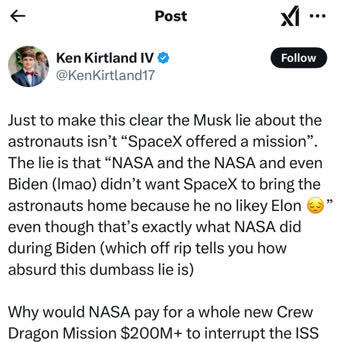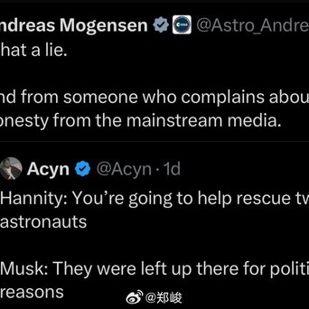 “澄清一下,马斯克关于宇航员的谎言并不是‘SpaceX 提供了一次任务’。真正的谎言是 ‘NASA 和 NASA(对,连 NASA 都说了两遍)甚至拜登(哈哈)不想让 SpaceX 送宇航员回家,因为他不喜欢埃隆 ——尽管 NASA 在拜登执政期间确实这样做了(光是这个事实就足以说明这个愚蠢谎言的荒谬程度)。