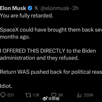 “你完全是个傻子。SpaceX 早在几个月前就能把他们带回来。我直接向拜登政府提出了这个方案,但他们拒绝了。返回计划确实因为政治原因被推迟。白痴。”